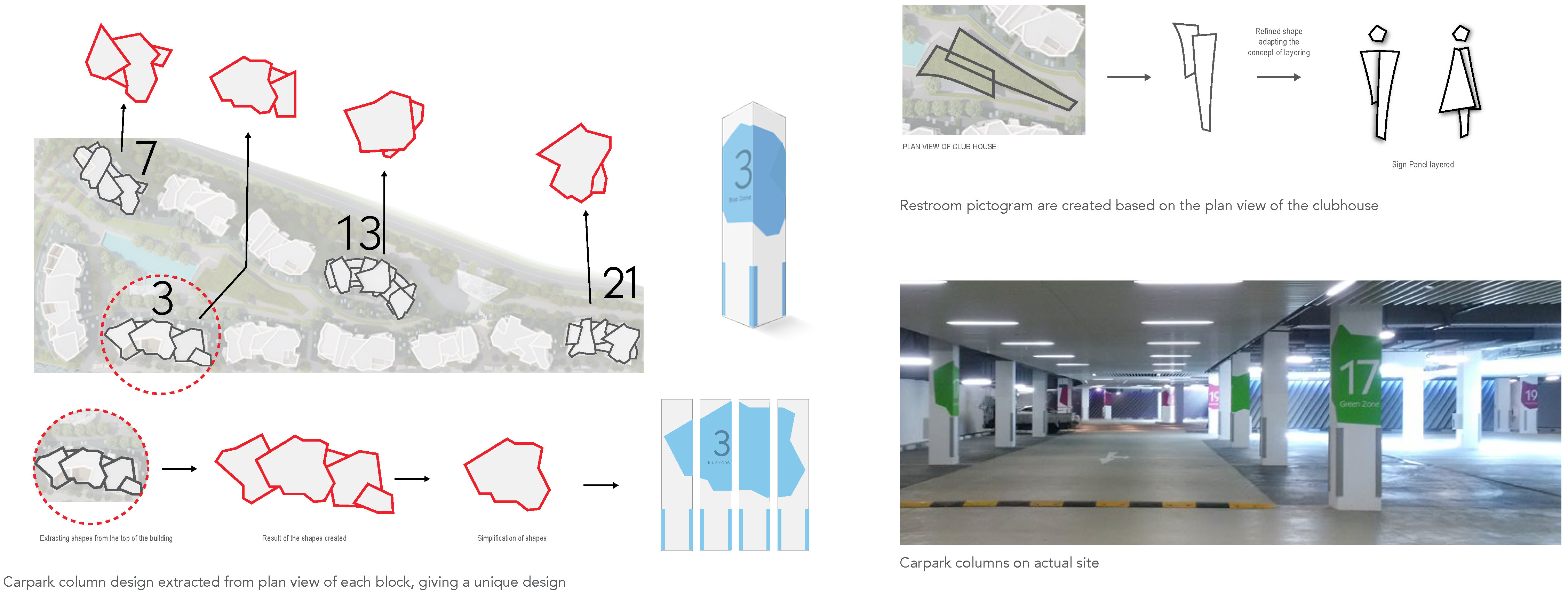 Each block is uniquely designed such that no two blocks has the same layout, allowing for easy identification inside the open carpark space. Getting inspiration from the development, corals, the pattern designed on the sign aims to mimic the growth and glow of a coral underwater. The design Wayfinding design system also address the uniqueness of each of the blocks.